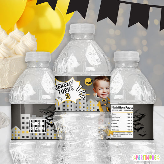 Gotham City Bat Superhero Water Bottle Labels | Custom Party Drink Stickers