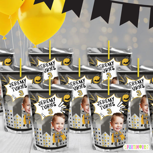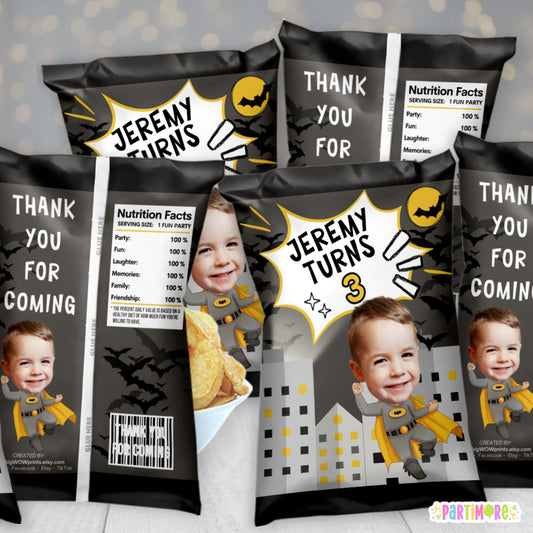 Personalized Gotham Bat Superhero Chip Bags | Custom Face Cutout Comic Book Party Favors | Flying Hero Treat Bags
