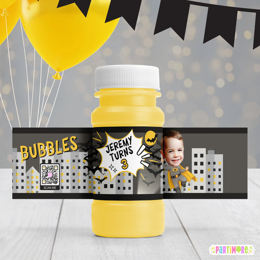 Bat City Defender Bubble Bottle Labels | Personalized Superhero Party Stickers