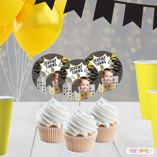 Heroic Bat City Cupcake Toppers | Personalized Superhero Birthday Decorations