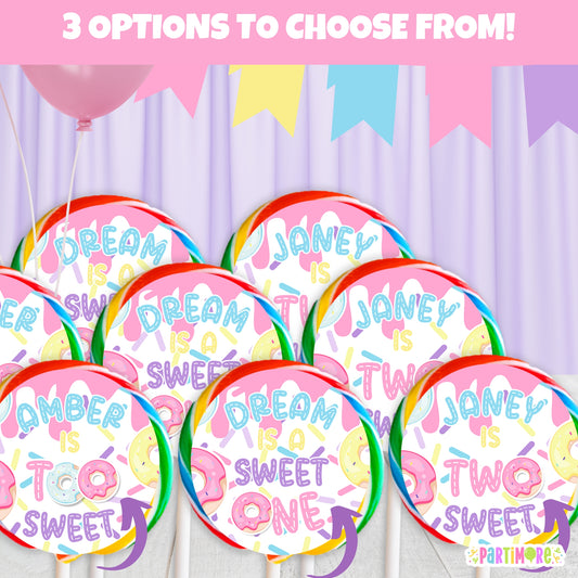 Girls Donut Lollipop Round Stickers | Custom Two Sweet 2nd Birthday | Sweet One 1st Birthday Decorations