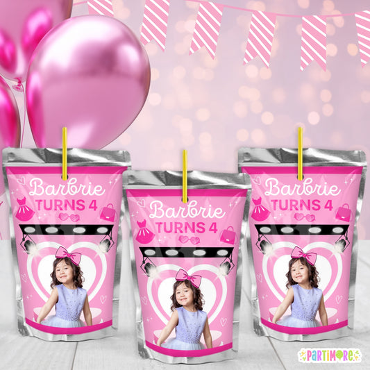 Fashion Doll Juice Pouch Labels | Custom Pink Glam Party Stickers