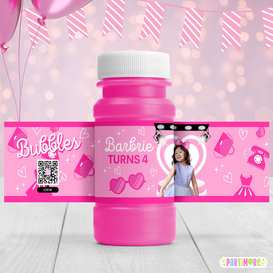 Sparkling Fashion Doll Bubble Bottle Labels | Personalized Pink Party Favors