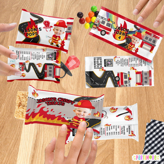Personalized Firefighter Candy Wrappers | Custom Photo Firefighter With Hat | Firetruck Birthday Party Favors