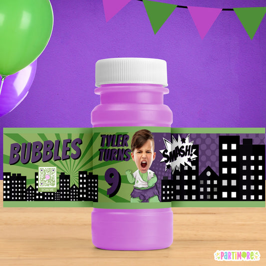 Personalized Green Smash Superhero Bubble Bottle Labels | Comic Party Stickers