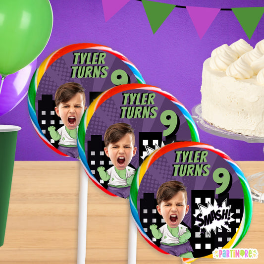 Personalized Green Smash Superhero Lollipop Round Stickers | Custom Comic Birthday Party Favor Labels