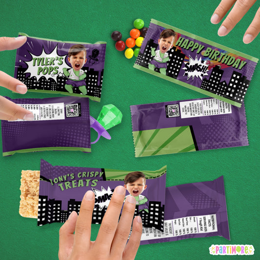 Custom Green Smash Superhero Candy Wrappers | Personalized Kids Comic Birthday Favors