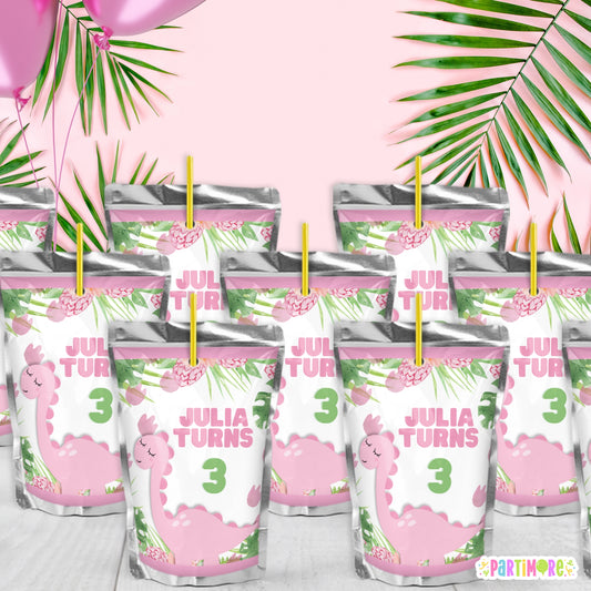 Personalized Pink Dinosaur Juice Pouch Stickers | Fun Party Drink Labels