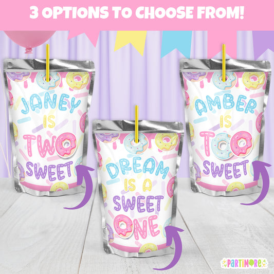 Custom Donut Juice Pouch Stickers | Personalized Girls Two Sweet 2nd Birthday | Sweet One Party Favors
