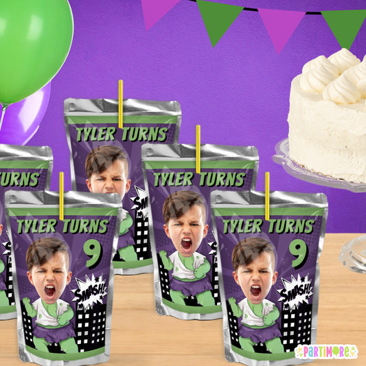 Custom Green Smasher Superhero Juice Pouch Labels | Personalized Kids Comic Birthday Party Favors and Decorations