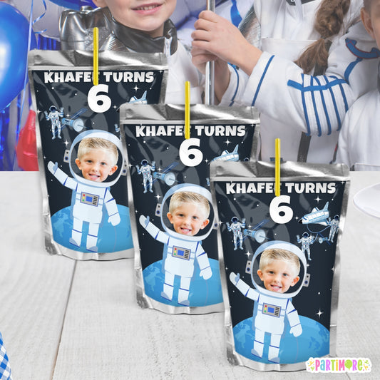 Personalized Outer Space Juice Pouch Labels | Custom Astronaut Birthday Party Adhesive Stickers
