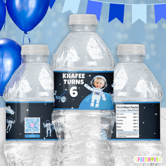 Personalized Outer Space Water Bottle Labels | Custom Astronaut Birthday Party Drink Wrappers