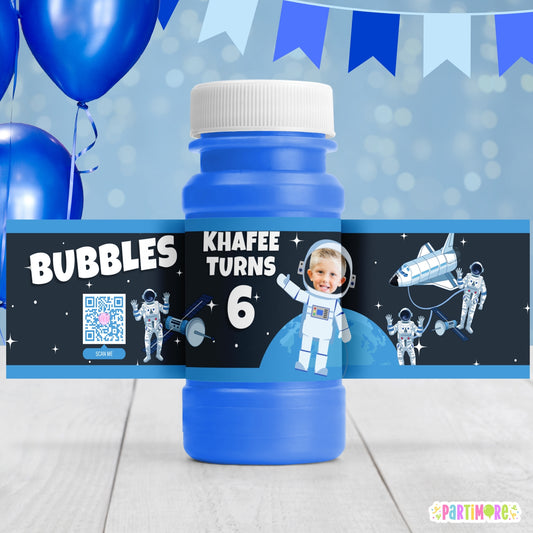Personalized Outer Space Bubble Bottle Labels | Custom Astronaut-Themed Party Favor Stickers