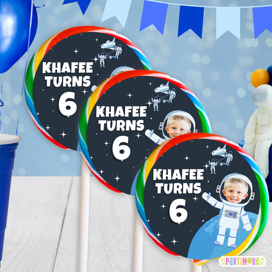 Personalized Outer Space Round Lollipop Stickers | Custom Astronaut Birthday Labels for Party Favors