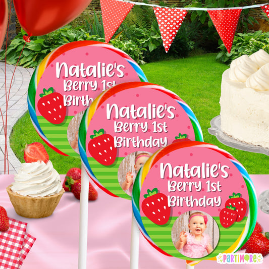 Strawberry Lollipop Stickers | Berry First Birthday Party Favors