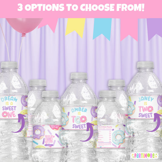 Personalized Donut Water Bottle Labels | Custom Girls Donut Themed Birthday Party Favor Stickers