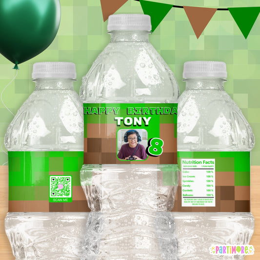 Pixilated Gamer Water Bottle Labels | Personalized Gaming Birthday Party Favor Stickers