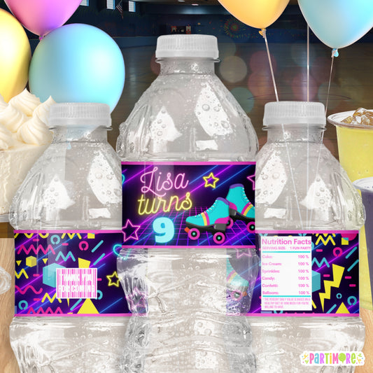 Neon Skating Water Bottle Labels | Personalized Retro Party Stickers