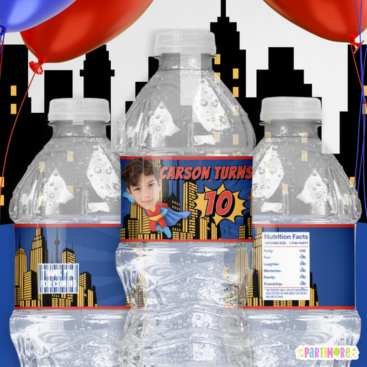 Flying Superhero Water Bottle Labels | Personalized Comic Party Stickers