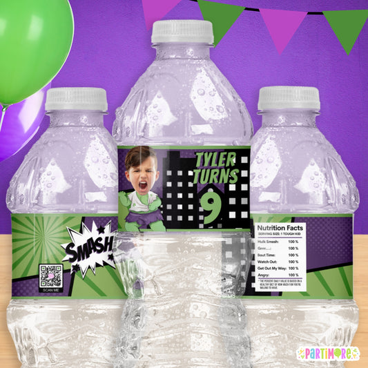 Green Smasher Superhero Water Bottle Labels | Personalized Kids Comic Themed Birthday Party Stickers