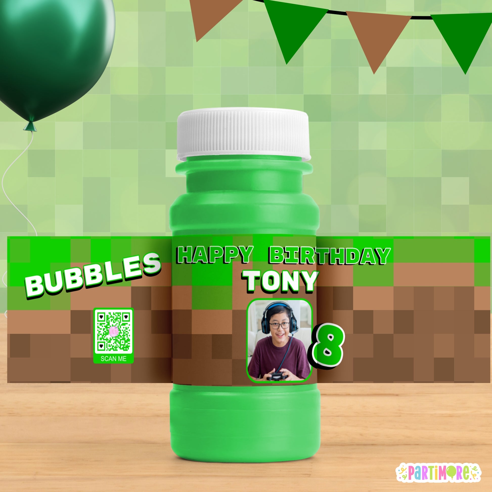 Add extra fun to your adventure birthday party with these custom pixel-themed bubble bottle labels! Featuring a grass block background, pixel elements, and personalization, these stickers turn simple bubble bottles into themed party keepsakes.