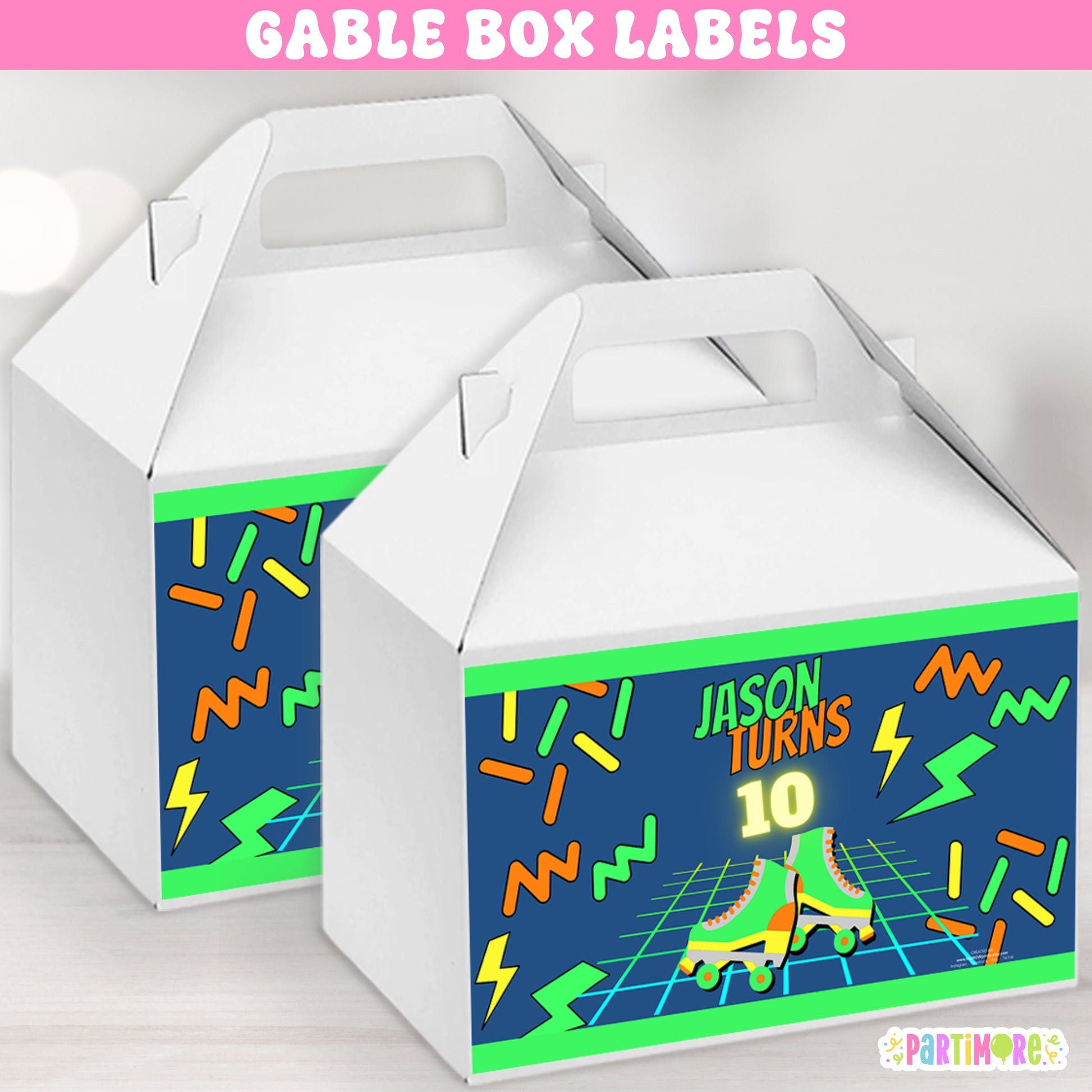 Send guests home with totally rad party favors using these custom roller-skating-themed gable box labels! Featuring bold neon roller skates, high-energy patterns, and customizable text, these stickers make favor boxes stand out!